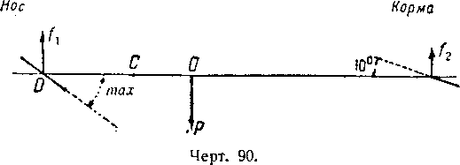 Будем поддерживать аэростат ла данном ходу при нулевом диференте и предположим, что он будет перетяжелен в центре объёма на величину р (чертёж 90).