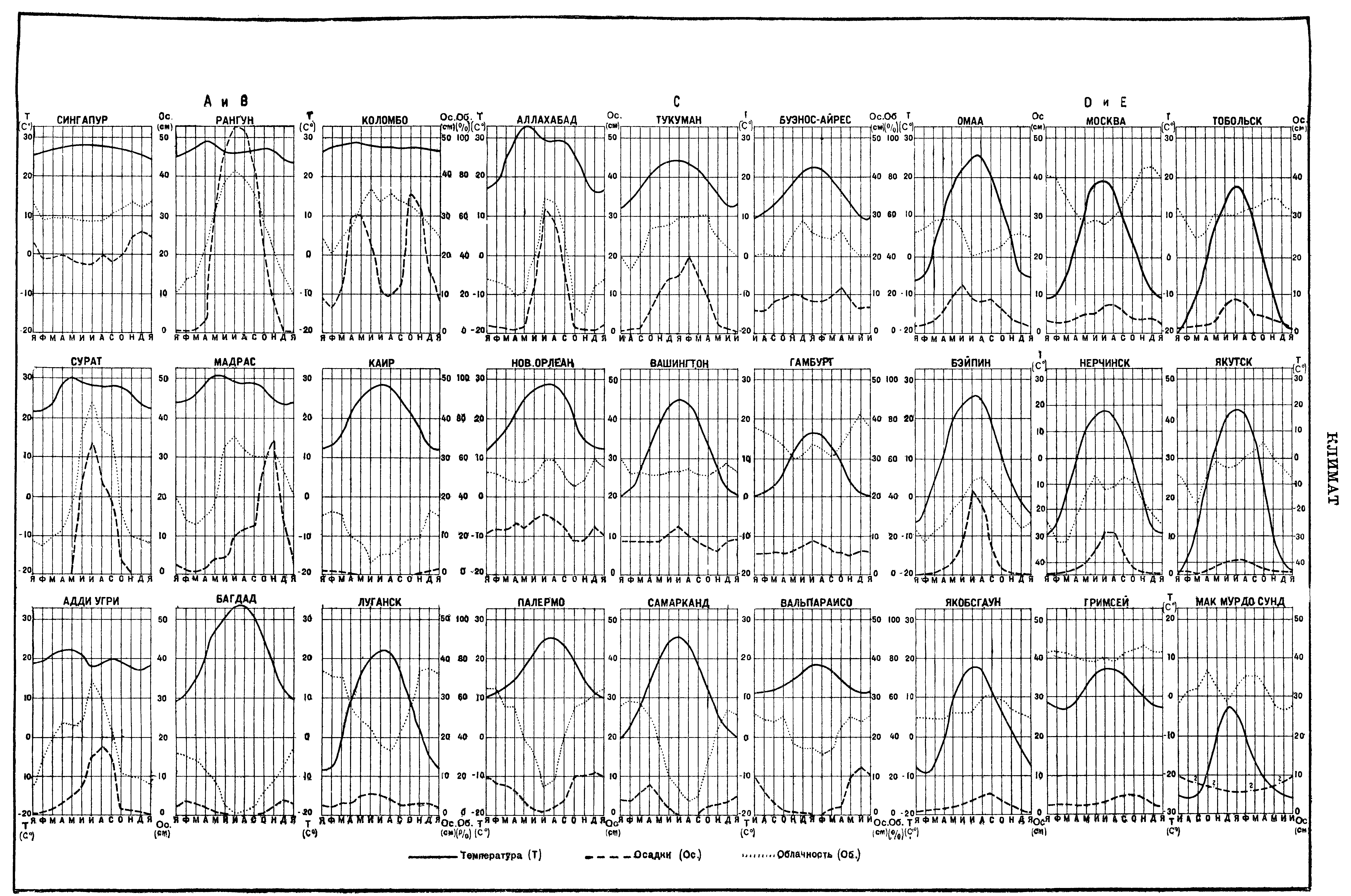 Рисунок 1. Температуpa воздуха, количество осадков и облачность 27 важнейщих климатических областей (А, В, С, D и Е означают типы климатов по Кеппену),