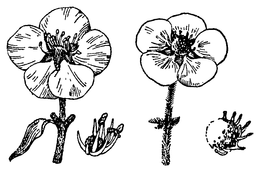 Цветки клубники: мужской — слева, женский— справа (справа цветка— плод).