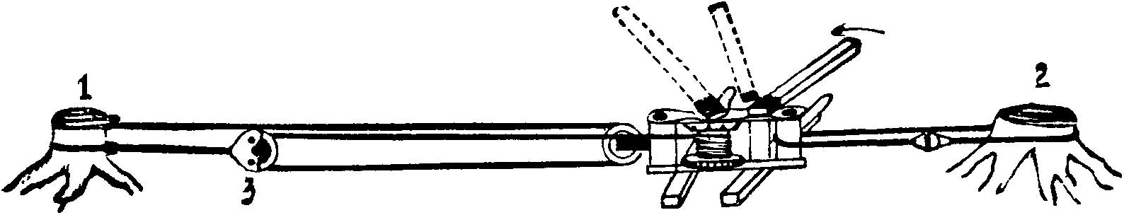 Рисунок 2. Схема работы ручной корчевальной машины: 1—корчуемый пень; 2—анкерный пень; 3— блок. ускорения процесса наматывания троса передается рычагом, кронштейн которого накладывается на квадрат в центре барабана. Нажимая на рычаг, рабочий обходит вокруг машины, и пень извлекается из земли. При более тяжелых условиях работы кронштейн с рычагом накладывается на квадрат вала храпового механизма. Рабочий, стоя на месте, движением рычага вперед и назад сообщает вращательное движение (против хода часовой стрелки) барабану. Намотка троса при этом осуществляется более медленным темпом в соответствии с небольшой скоростью вращения барабана. Во время процесса корчевания барабан удерживается тормозными собачками, предотвращающими возможность вращения его в обратную сторону. Когда пень ослабнет в земле и сопротивление его