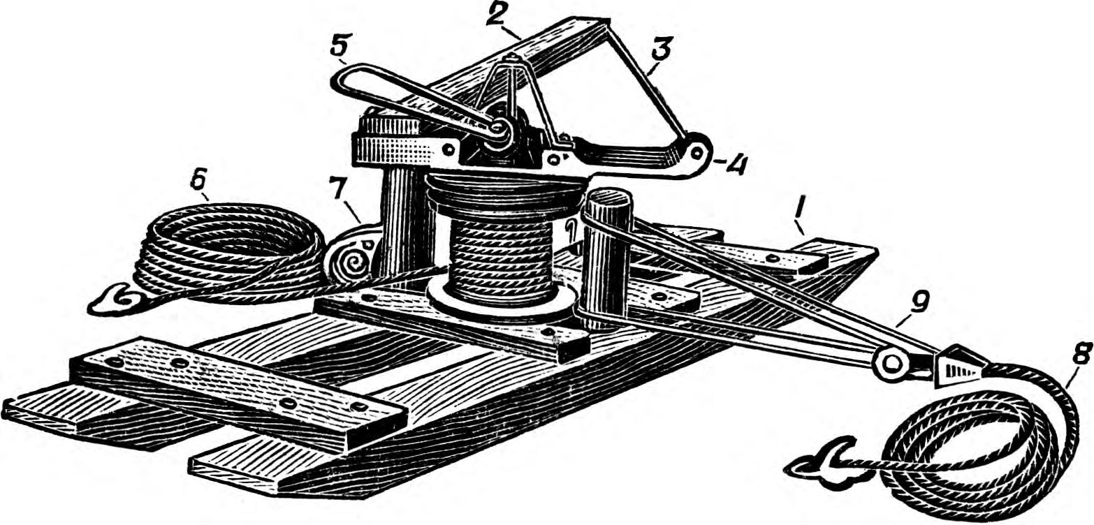 Рисунок 3. Общий вид конной корчевальной машины: 1—деревянная рама-салазки; 2—водило; 3—тяговая штанга-струна; 4—водильная коробка; 5— рычаг сцепления муфты; 6—рабочий трос; 7—блок; S—анкерный трос; 9— стальная петля рамы. уменьшится, рычаг перемещается на квадрат, находящийся в центре барабана, и пень вытаскивается ускоренным темпом. На концах стальной рамы находятся 2 стойки. Одна из них имеет сбоку прилив в виде скобы, в которой штырем укрепляется блок, применяемый для увеличения силы тяги троса. Другая, противоположная стойка соединяется во время работы специальным анкерным тросом с упорным (анкерным) пнем, которым и удерживается К. м. на месте в момент вытаскивания пня.