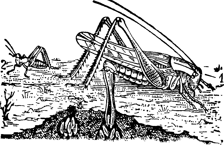 1—самка, откладывающая в землю яйца; 2—молодая личинка. но отродившимися личинками, которые вначале держатся плотными группами и потому легко засыпаются и раздавливаются, особенно при применении тракторной тяги; помимо того— освоение под сельскохозяйственные культуры гнездилищ кузнечиков (кустарниковых зарослей, пустошей и прочие). Г. Бей-Биенко.