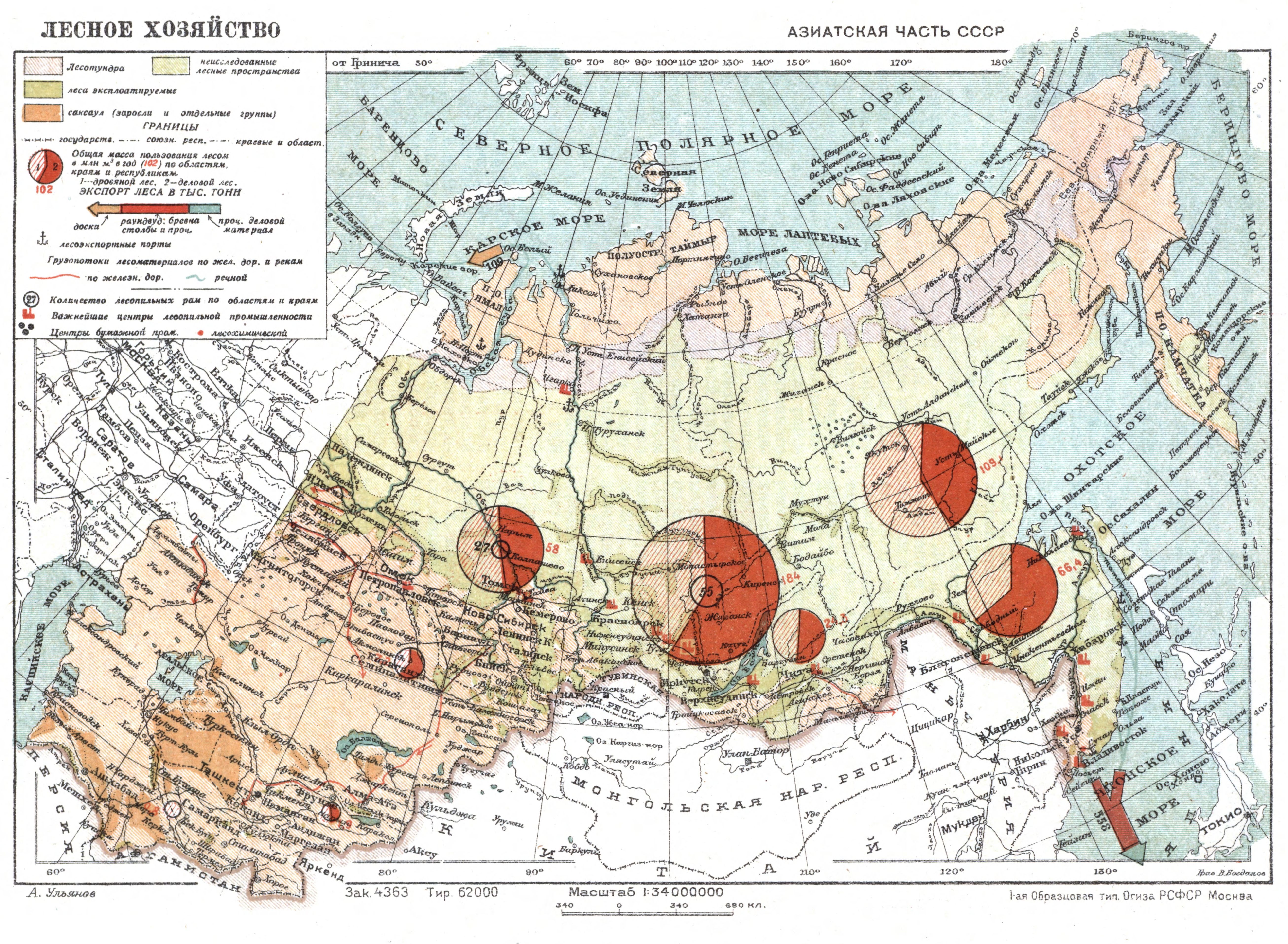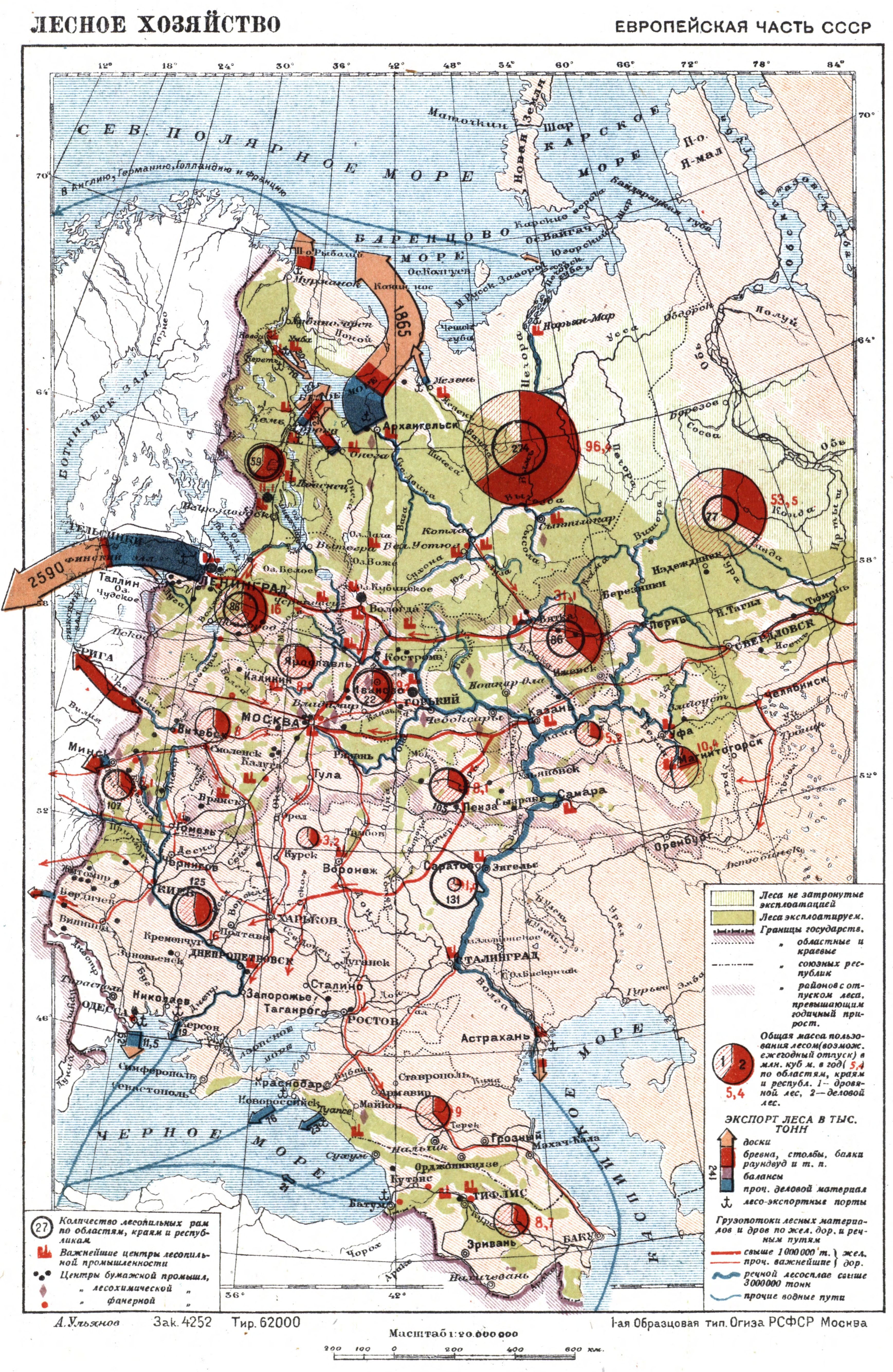 Лесное хозяйство, лесной фонд СССР ориентировочно определяется в 950 млн. га общей лесной площади, из них на территории РСФСР находится 918 млн. га, в УССР—3,8 млн. га, в БССР—3,5 млн. га, в ЗСФСР— 4,0 млн. га, в Узбекской ССР—1,5 мдн. га, в Туркменской ССР—16,8 млн. га и в Таджикской ССР—2,0 млн. га. В этом лесном фонде покрытая лесом площадь составляет 454 млн. га, в том числе под хвойными породами 352 млн. га и лиственными—102 млн. га, с общим количеством спелой и приспевающей древесины около 29 млрд, м3 (хвойных пород 24 млрд, м3 и лиственных—5 млрд. м3). Значение Л. х. определяется прежде всего его ролью как поставщика строительных и поделочных лесоматериалов для всех отраслей народного х-ва. Потребности соц. х-ва в лесоматериалах в условиях огромного строительства весьма велики. Вывозка деловой древесины увеличилась с 41,1 млн. м3 в 1927/28 до 98,5 млн. м3 в 1 932, то есть возросла за 4х/2 года в 2,4 раза. Производство пиломатериалов увеличилось с 11,5 млн. м3 в 1927/28 до 24,47 млн. л3 в 1 932, а на 1 937 запроектировано в размере 43 млн. м3.