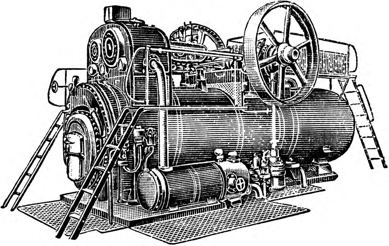 вляется из котельного железа. Производительность его измеряется количеством кг пара, получаемого в час с 1 м2 поверхности нагрева, обращенной к газам со стороны котла, и колеблется в пределах 12—30 килограмм пара. Внутреннее пространство котла распадается на паровое и водяное, разделяемые друг от друга поверхностью испарения. Паровое пространство должно быть по возможности большого размера, чтобы дать пару время выделить из себя увлеченную с ним воду. Для удобства пользования котлом и обеспечения безопасности работающих Л. оборудуется рядом приспособлений (арматура), которые состоят из питательного и парозапорного клапана (вентиль), предохранительного клапана, водомерного прибора, указывающего уровень воды в котле, инжектора—насоса питания, манометра для указания давления пара и сигнального свистка. В нижней своей части котел снабжен продольным краном, при помощи которого вода может удаляться из него. Пуск пара производится посредством регулятора, управляемого от руки. Паровая машина обычно устанавливается на котле. Ее назначение—превращать полученную в котле энергию пара в движущую силу. Это превращение одного вида энергии в другой осуществляется при помощи ряда промежуточных механизмов. От поршня, движущегося взад и вперед, движение передается посредством штока крейцкопфу, движущемуся по прямолинейным направляющим, а его возвратно-поступательное движение превращается при помощи шатуна и кривошипа во вращательное. Когда поршень находится в конечном левом положении, кривошип образует прямолинейное продолжение штока и шатуна; когда поршень занимает крайнее правое положение, шатун и кривошип лежат также на одной прямой. Ни в одном из двух случаев поршень не может привести кривошип в движение, ибо направление силы поршней проходит как-раз через середину вала. Оба эти положения называются мертвыми точками машины. Для устранения возможности остановок машины в мертвых точках на кривошипный вал насаживается маховик, который в силу закона инерции помогает машине переходить через эти мертвые точки. Парораспределение— принудительное золотниковое, или клапанное. Золотник неизменно связан с золотниковым штоком и посредством эксцентриковой тяги получает прямолинейно-возвратное движение от эксцентрикового кривошипа на главном валу машины. Регулятор системы «Гартунг» движется в замкнутом кожухе.— Идущие с решотки продукты горения (газы), проходя через дымогарные трубы, отдают тепло находящейся в котле воде. В результате этого получается парообразование. Отработанные продукты горения по дымовым каналам и дымовой трубе выходят наружу. Образовавшийся в котле пар через золотниковые каналы поступает в рабочий цилиндр паровой машины, попеременно с правой, и левой стороны поршня. Там он расширяется и своим давлением заставляет находящийся в цилиндре поршень перемещаться, после чего выходит через паровыпускное отверстие. Движение от поршня передается посредством штока крейцкопфу, движущемуся по параллелям. Возвратно-поступательное движение крейцкопфа при помощи шатуна и кривошипа превращается на коленчатом валу машины во вращательное движение.