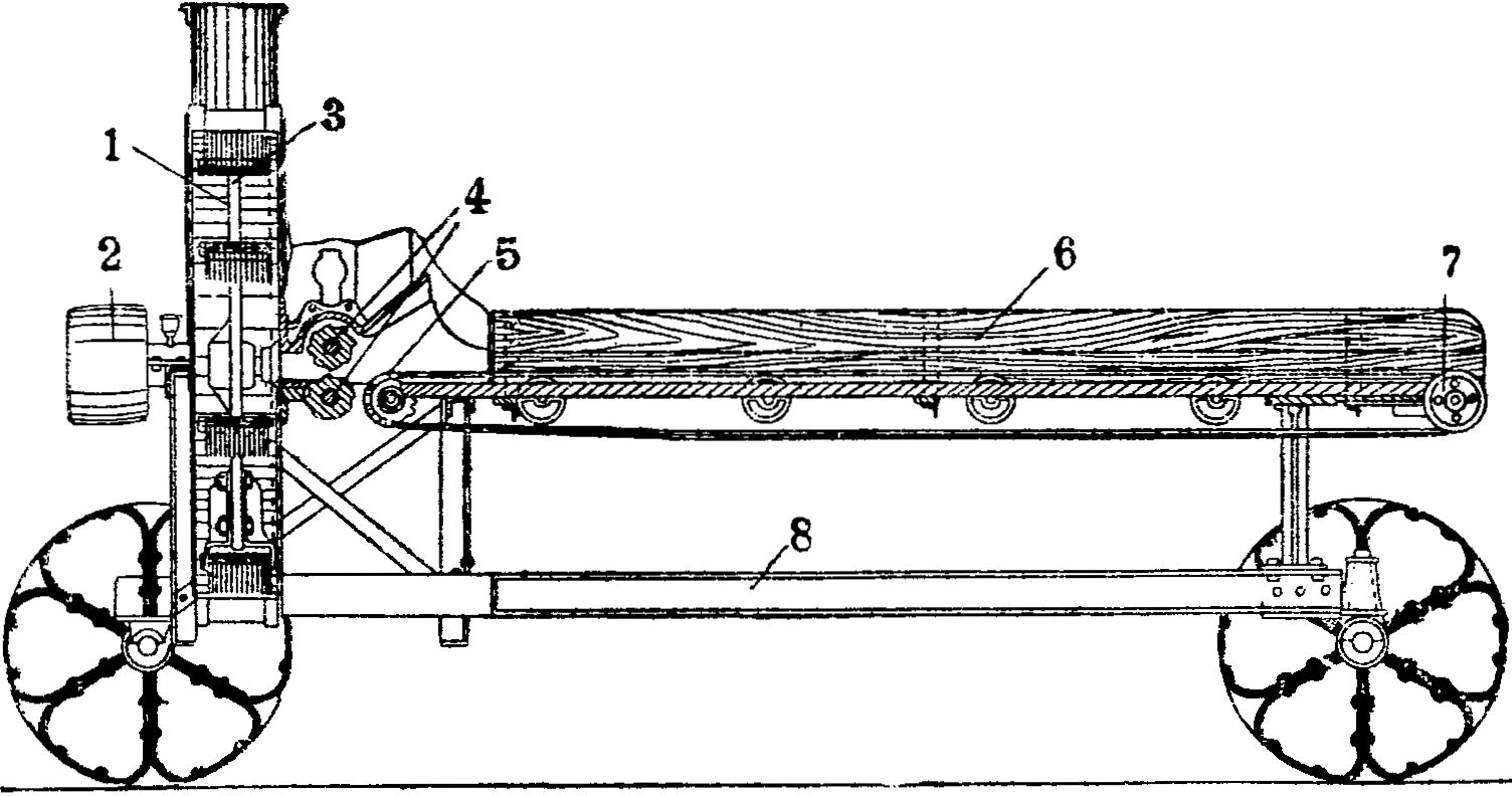 Рисунок 6. Продольный разрез механической силосорезки Гомсельмаша: 1—кожух вентилятора; 2— шкив; 3—диск вентилятора; 4—подающие вальцы; 5—цепь транспортера; 6—деревянный жолоб; 7— ролик натяжной; S—рама хода силосорезки.
