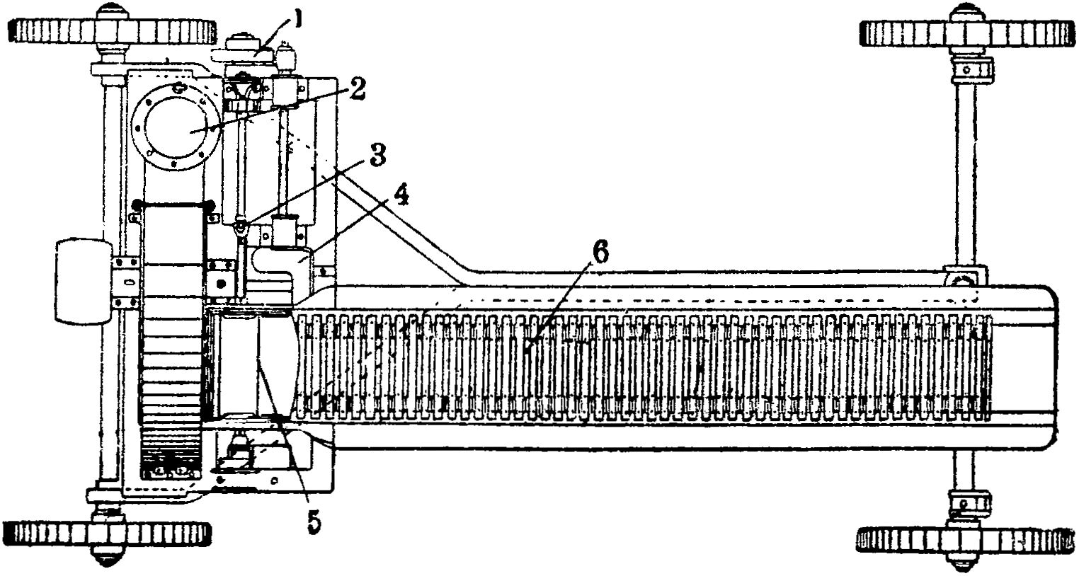 Рисунок 7. Механическая силосорезка Гомсельмаша (вид сверху): 1—включение и выключение; 2— патрубок; 3—шарнир Гука; 4—конические шестерни; 5—крышка с вальцами; 6—транспортер.