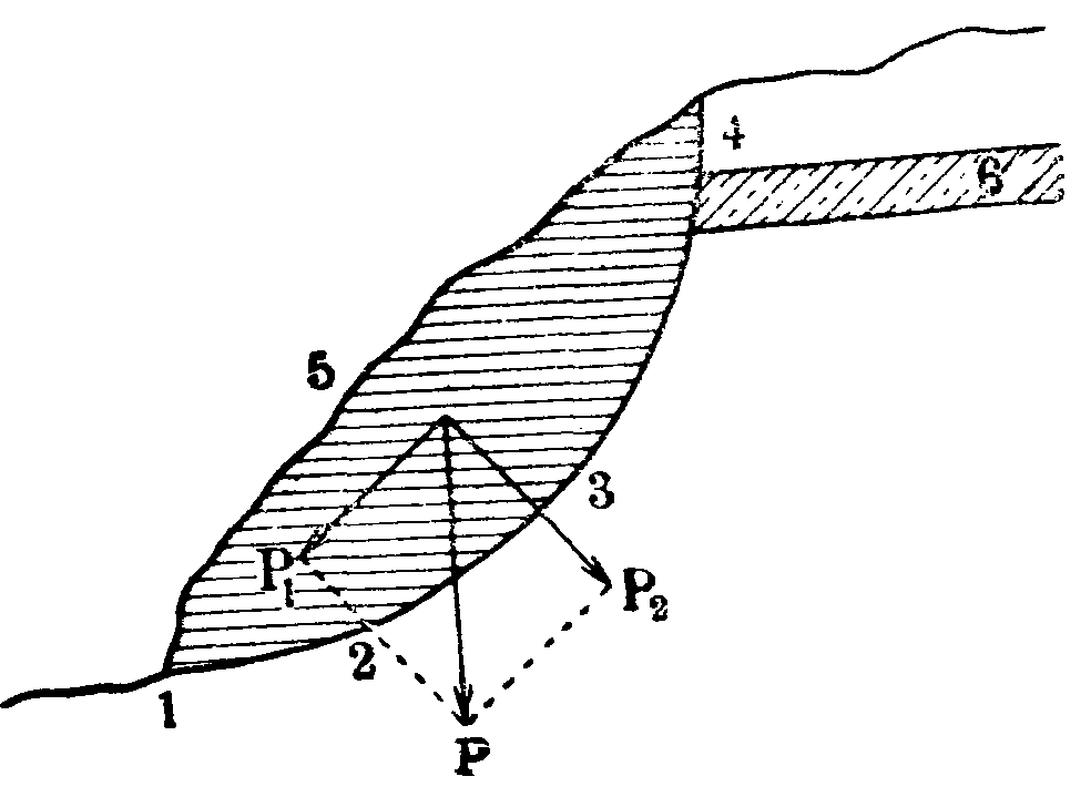 Схема оползня: 1, 2, 3, 4— линия плоскости сползания; 7, 2, 3, 4, 5—неустойчивая масса; 6—грунтовые воды; Р— вес неустойчивой массы; Р±— сила, вызывающая сползание; Рг — сила, противодействующая сползанию.