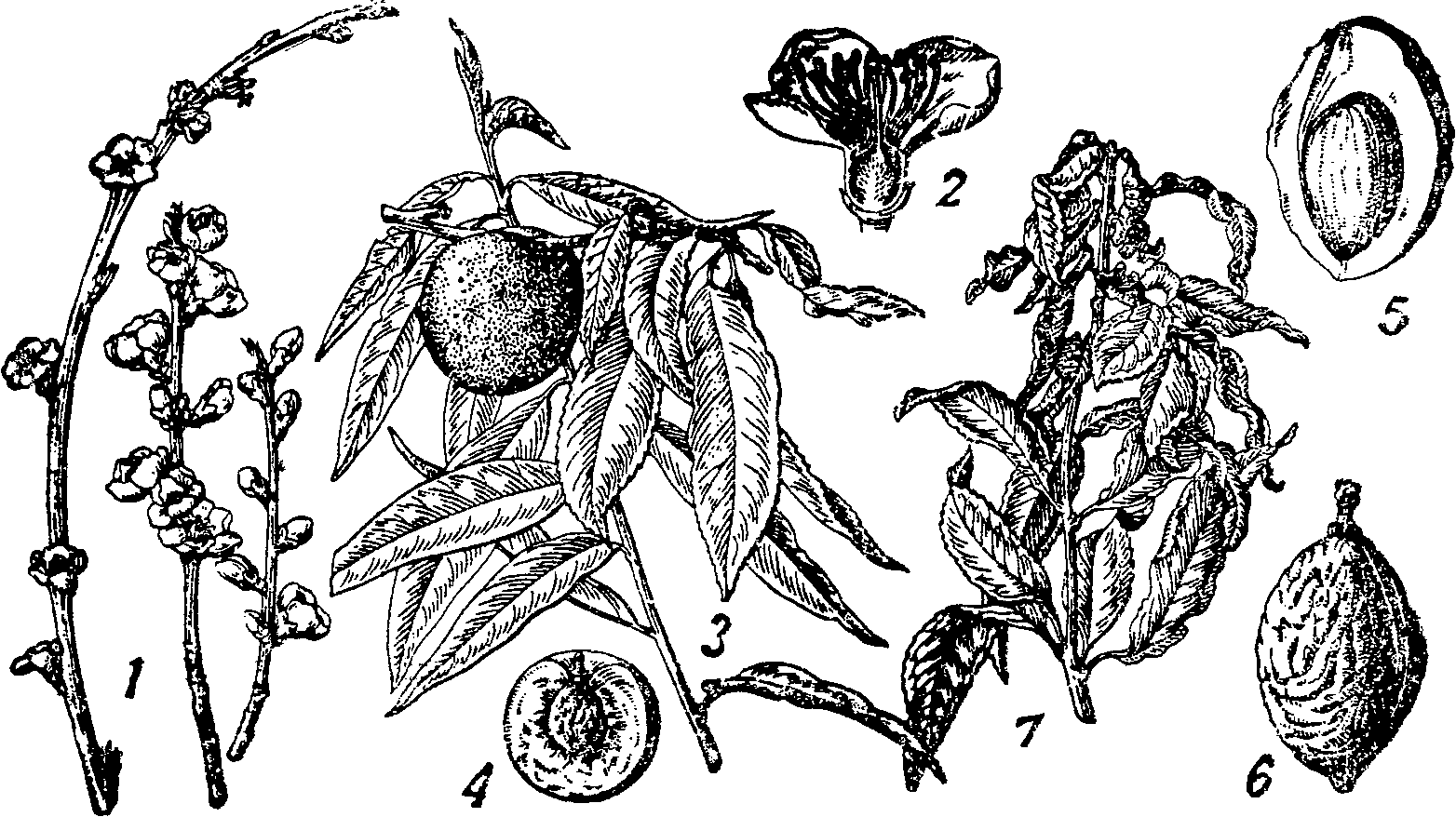 1—цветоносный побег; 2—цветок в продольном разрезе; 3—ветка с плодом; 4—разрез плода; 5— раскрытая косточка; 6—косточка; 7—курчавость листьев, вызываемая Taphrina deformans.