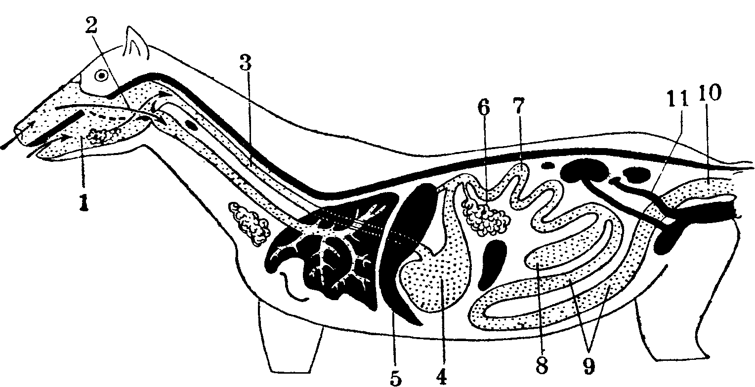 Схема пищеварительного аппарата лошади: 1—ротовая полость; 2—глотка; 3—пищевод; 4—желудок; 5—печень; 6—поджелудочная железа; 7— средняя (тонкая) кишка; 8, 9, 10—задняя (толстая) кишка (8—слепая кишка; 9—ободочная кишка; 10— прямая кишка); 11—яйцевод.