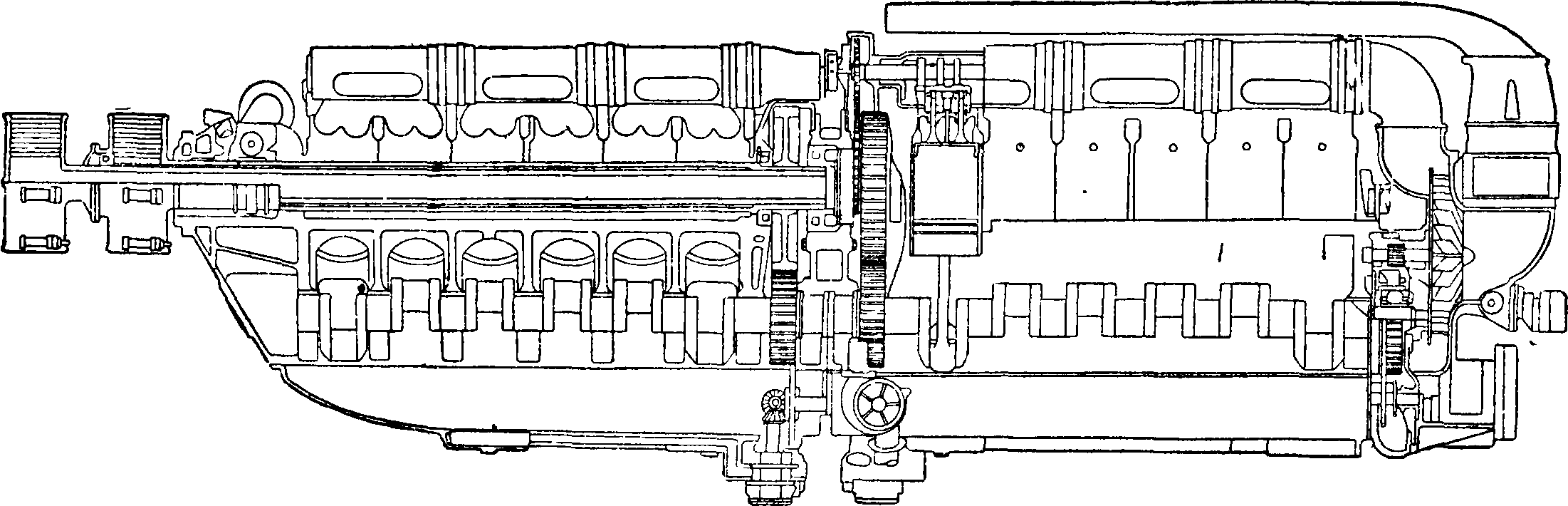 Наибольшая высота, достигнутая дизельмо-тором, 9 000 метров («Феникс», 1934 г.). В табл. 7 приведены данные основных современных (1934 г.) типов А. д. тяжелого топлива. На фигуре 20 и 1 изображены разрезы двигателя Паккард, первого из А. д. тяжелого топлива, поднявшегося в воздух на самолете. Характерной особенностью