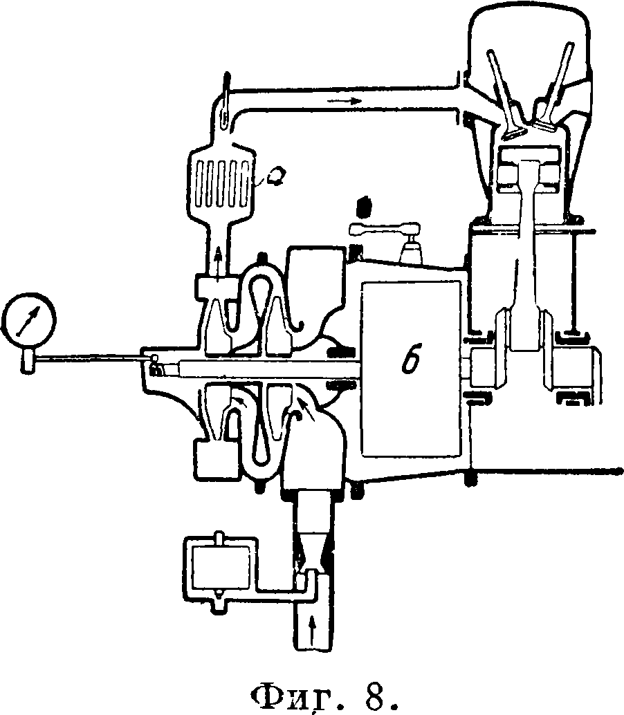 большей высотности, и тогда делают многоступенчатые, выключающиеся нагнетатели. Дву ступенчатый нагнетатель Рато-Фарман показан на фигуре 7, а на фигуре 8 дана схема его установки на двигателе. На схеме показан холодильник воздуха а и сцепление с мотором б. Дополнительный вер одноступенчатого центробежного нагне-