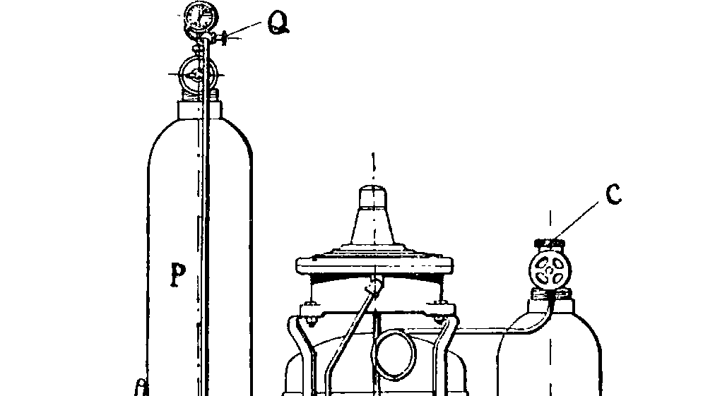 Н— предохранительный клапан, Р — кислородная бутыль, Q — редуктор для кислорода. работах, в виду легкости передвижения и большой портативности аппарата.