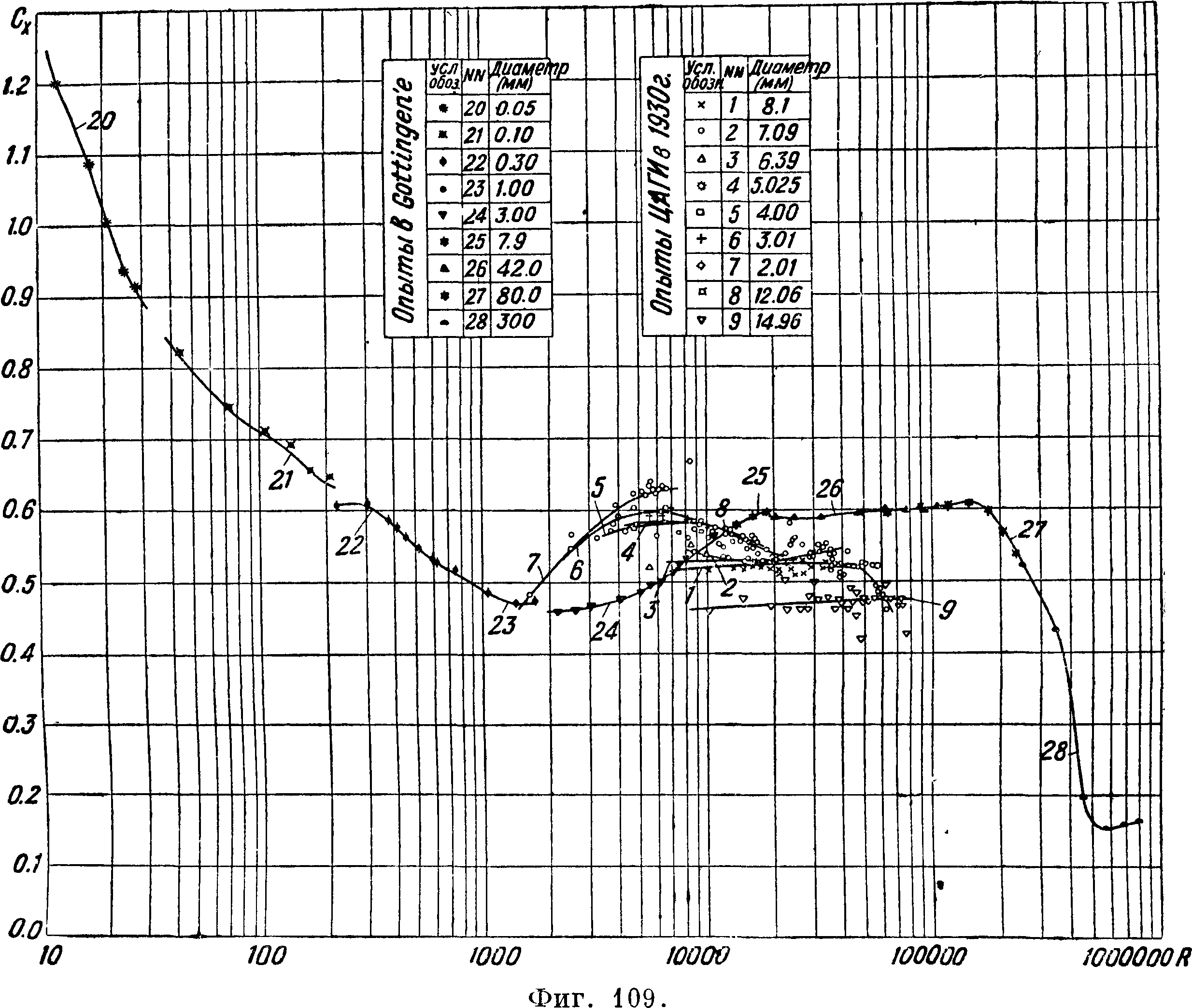 же фигуре даны и опытные точки. Кривая 6 соответствует случаю ламинарного пограничного слоя (Cf=~~ |[2]. Кривая 5 соответствует случаю чисто турбулентного пограничного слоя /Су= -f3-^2]. Более точное решение задачи [3]