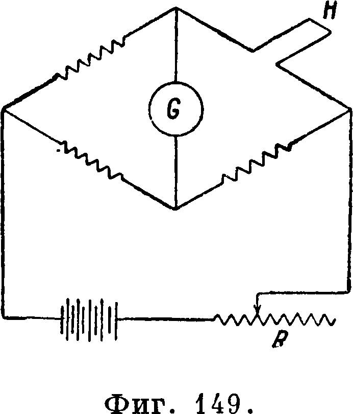 2) Метод постоянной температуры нити (фигура 150). Измеряемый диапазон скоростей для этого метода составляет примерно от 0,5 до 10 —12 м/ск. Стрелка гальванометра G