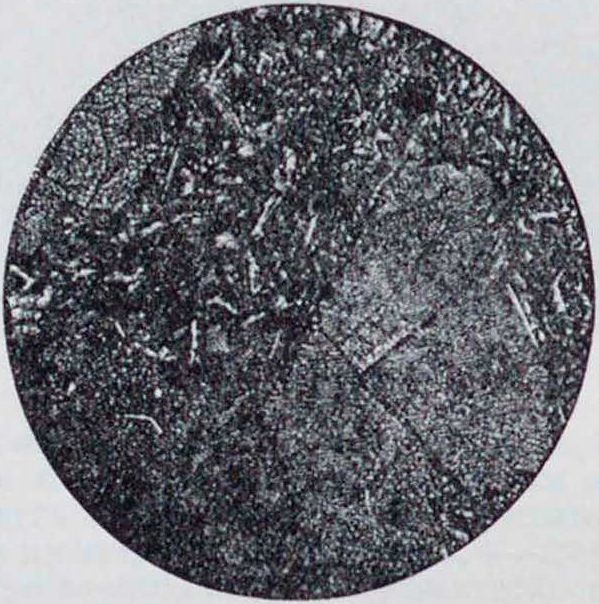 Фигура 4. Микроструктура базальта, расплавленного и остеклованного при быстром охлаждении. Увел. 75.