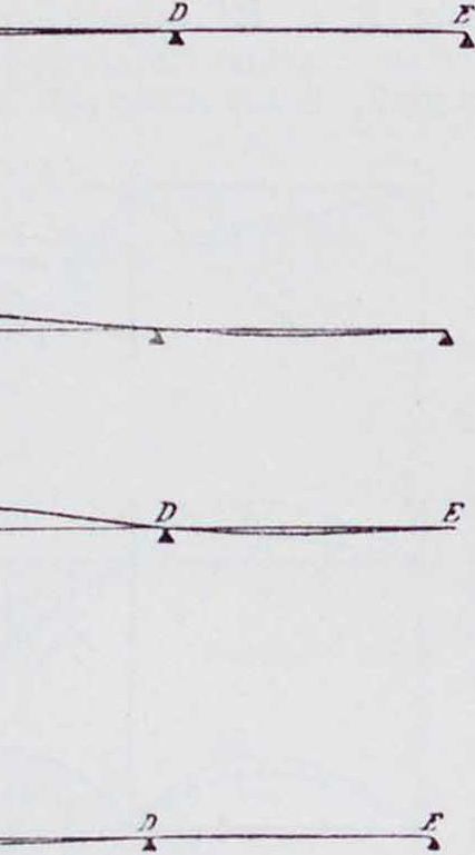 Последние выражения, дающие тот же результат, что отношения e: е на фигуре 36, получатся из общих формул, если представить за крайними стойками еще бесконечно-большие пролеты 10 и („х, которые вследствие бесконечной длины настолько гибки, что не препятствуют деформации системы. Статически неопределимые опорные моменты балки при любой одновременной нагрузке всех пролетов м. б. найдены решением системы ур-ий, выражающих равенство углов поворота β, а и т упругой линии балки и