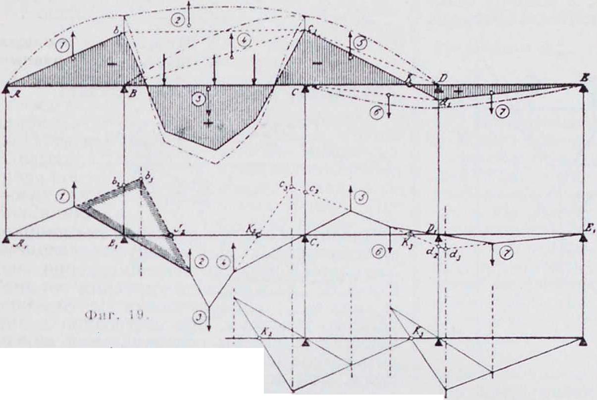 2. Фокус ы. Изгиб Б. η. между крайними опорами должен быть таков, чтобы упругая линия проходила через точки II и C на промежуточных опорах. По Мору (Mohr), упругую линию можно получить как веревочный мн-к для балки, лежащей на крайних опорах А. и Е (фигура 2) и нагруженной между ними площадью ]ч. 1ак как EI постоянно (Е—модуль упругости балки, 1 момент инерции поперечного сечения), то за фиктивную нагрузку принимается площадь эпюры моментов, что и сделано в дальнейшем. На фигуре 2 моментная площадь разбита по пролетам; загружен только второй пролет. Все участки от (ί) до (7), исключая площади М0(3),—тр-ки, линии центров тяжести которых проходят на расстоянии одной трети пролета от опор. Площадь вывернутой трапеции в пролете 13 получится, как разница между отрицательным тр-ком (5) и положительным (б). Если для заштрихованной площади фиктивной нагрузки построить второй веревочный многоугольник Л!—с горизонтальной замыкающей А,В, то истин, точки упругой линии получатся только против границ отдельных площадей нагрузки, и т. о. точки пересечения В1г О, Ε>! замыкающей со сторонами веревочного-