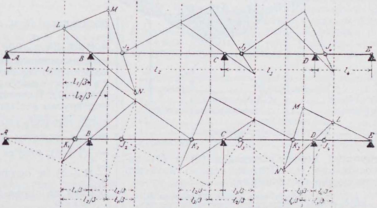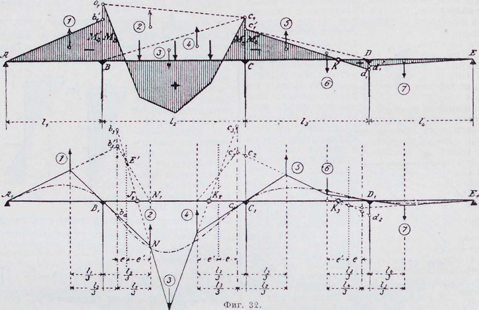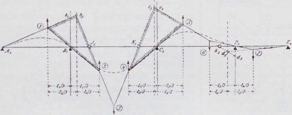 Фиг. линии на опорах. Поэтому этот веревочный мн-к называют также упругим тангенциальным мн-ком. Вершины углов его лежат на неизменных вертикалях, проходящих через ц.т. площадей эпюры М0. Кроме того, вертикали, проходящие через точки b3, с3, d3, также остаются неизменяемыми, так как соответствуют положению равнодействующих примыкающих друг к другу тр-ков (1)—(2), (4)—(5), (б) (7). Эти вертикали делят расстояние между линиями центра тяж. смеж. тр-ков в обратном отношении их площадей или пролетов. Следовательно, точки пересечения b3, с3, d3 лежат на «линиях обратных третей» или «сдвинутых опорных вертикалях» (при равных пролетах — просто на опорных вертикалях).