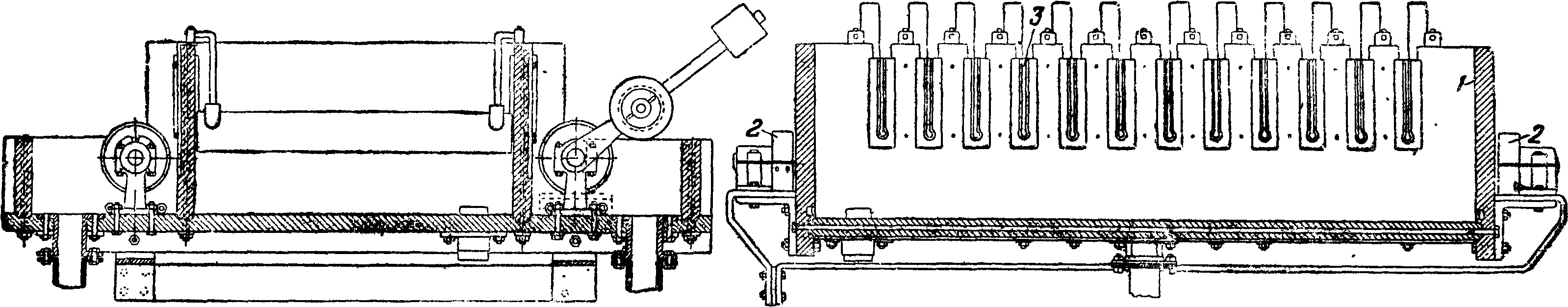 4— 5 миллиметров полосы подаются на гильотинные ножницы для разрезки на необходимые размеры и прочистки концов, после чего подвергаются травлению в 5—10%-ном растворе H2S04i подогретом до 40—60°, в который добавляются 10% (по объёму) присадок от травильного раствора. После травления биметаллич. заготовки промываются в воде и поступают на чистку кардными щетками и сушку в древесных опилках. Лучшие результаты получаются при пользовании чистильно-промывочно-сушильными машинами. Высушенные полосы затем поступают на сортировку. Признанные годными заготовки поступают на прокатку в холодном состоянии. Прокатка в холодном состоянии обычно ведется в направлении, перпендикулярном к направлению прокатки в горячем состоянии. Прокатку в холодном состоянии с 5 миллиметров обычно ведут на стане дуо с валками 0 500 миллиметров, I — 900 миллиметров с числом оборотов п=17, что дает скорость прокатки 0,44 м]ск. Прокатка 5 — 3,3 миллиметров производится в 8 проходов по схеме