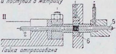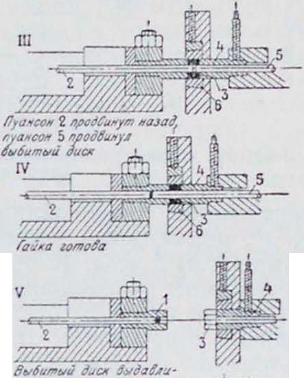 в между пуансонами 1 и 4 и стремится заполнить свободную часть матрицы. Одновременно с этим проки 2 и .5 с двух сторон проникают в зажатый между пуансонами кусок железа и заставляют нагретый металл окончательно заполнить свободную часть отверстия матрицы 6 и таким образом принятв окончательн. форму гайки. Между проками при этом остается небольших размеров тонкая пластинка, которая выбрасывается иро-ком5. Привозвра-шении матрицы и пуансонов в исходное положение гайка выбрасывается из матрицы.