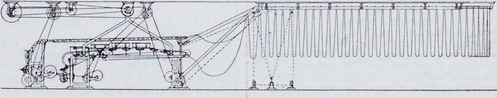 цилиндрами.Пройдя узлоловители,масса через напускной ящик W поступает на сетку 3. Сетка в верхней своей части поддерживается грудным валом 4 и рядом регистровых валиков 5, которые м. б. устанавливаемы выше или ниже для выравнивания поверхности сетки. От напускного ящика W к сетке ведет деревянный или металлич. лоток, покрытый куском тонкой резины, «фартуком» 2, налегающим на скользящую под ним переднюю часть сетки. В месте окончания фартука поперек машины расположены металлические пластинки-линейки, которые м. б. установлены выше или ниже, увеличивая или уменьшая щель над регистровыми валиками; через эту щель масса стекает на сетку. При поступлении на сетку вода быстро стекает из массы, причем этому способствует вращательное движение регистровых валиков, которое производит отсасывающее действие на воду, содержащуюся в движущейся по сетке массе. Скорость поступления массы на сетку зависит главн. образ, от высоты слоя массы перед линейками, причем для правильного свой-лачивания волокон эта скорость и скорость движения сетки должны быть по возможности близки между собой. По мере увеличения скоростей Б. м. высота напора массы перед линейками становится недостаточной, поэтому для увеличения скорости истечения массы сетке придают уклон к гауч-валу. При очень быстрых ходах современных газетных Б. м. оказывается, что недостаточно давать уклон сетке, поэтому вместо линеек стали применять высокие ящики, в которые поступает бумажная масса; в каждом таком ящике возле дна проделана узкая регулируемая щель, через к-рую масса устремляется на быстро движущуюся сетку. Чтобы масса не могла стекать но краям сетки, по ней движутся бесконечные «декельные ремни», образующие вместе с упомянутыми линейками замкнутое со всех сторон ограждение, которым и удерживается бумажная масса на сетке. Для лучшего евойлачивания волокон массы регистровой части Б. м. придают боковое колебательное движение, так называемым тряску, при посредстве специального эксцентрикового механизма. Такая тряска вместе с поступательным движением по направлению хода сетки способствует свойлачиванию волокон в разных направлениях. Размах колебательного движения части сетки, прилегающей к грудному валу, может меняться, причем он составляет обыкновенно около С миллиметров (а в исключительных случаях может быть доведен до 15 миллиметров). Тряска может меняться от медленного колебания с большим размахом до коротких редких ударов; как правило считают, что. при коротком волокне и тонкой бумаге, чем сильнее тряска, тем лучшего качества получается бумага. Современные быстроходные машины для выработки газетных бумаг делаются без тряски. За регистровыми валиками сетка проходит над рядом отсасывающих ящиков, сосунов 6, которые из влажной бумажной полосы удаляют еще некоторое количество воды. Обычная конструкция сосуна—ящик из металла или дерева, прямоугольного сечения внутри. Дно ящика соединено с воздушным насосом посредством трубы. Внутри ящика имеются две перегородки, устанавливаемые непосредственно под краями бумаги, чтобы не допускать поступления воздуха в ящик. Указанные перегородки (обычно эбонитовые) могут быть передвигаемы к середине или к краю ящика посредством маховичков и стержней, концы которых закреплены в пазах перегородок. Сверху ящик обычно покрыт продыря