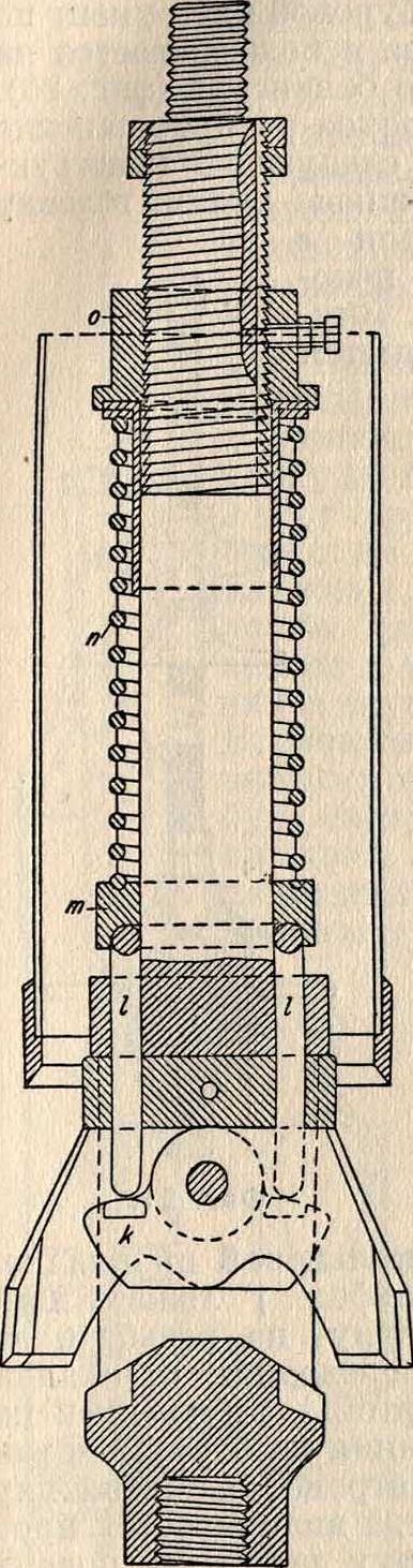 Неудобства, возникающие при обрыве поводков, отсутствуют в расширителях без поводков, системы Похвалла (смотрите фигура 23). Здесь резцы расширителя снабжены хвостовыми придатками к. В корпусе и подушке расширителя просверлены два отверстия, сквозь которые пропущены два стержня I, упирающиеся одним концом в придатки к резцов, а другим, в виде головки, в канавку шайбы т. Шайба т прижимается к стержням I пружиной п, упирающейся другим концом в гайку о, навернутую на нарезной конец ствола расширителя и регулирующую степень нажима на пружины. Впоследствии Похвалла заменил два стержня одним, который действует одновременно на оба резца.