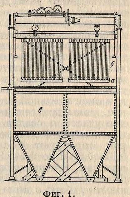 Холщевая или полотняная наволока а, служащая фильтрующей поверхностью, надевается на четырехугольную раму б, три стороны которой (две боковые и нижняя) собраны из свинченных под прямым углом металлических труб. Свободные концы труб заделаны в верхней деревянной стороне рамы т. о., что один конец свинченных труб закрыт наглухо, а другой выступает из деревянной части рамы наружу. На деревянной части рамы наглухо закрепляются и открытые концы холщевой наволоки. Труба, образующая нижний край рамы, имеет по верху отверстия, через которые из наволоки отсасывается воздух, если выступающий наружу конец трубы через коллектор г присоединен к вакууму. Чтобы избежать происходящего при этом сближения