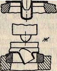 Второй операцией, производимой над трубами, является изгибание их для руля, задней стойки и для рамы дамских велосипедов. Для этого их заливают канифолью или применяют особые гибкие стальные стержни. Трубы изгибают по лекалам от руки или в прессах и на специальных станках. Приспособление, употребляемое для изгибания руля в эксцентриковом прессе с большим ходом, изображено на фигуре 4. Оно состоит из нижней матрицы М, опирающейся снизу на сильные пружины из неопускающихся роликов аа и связанных с верхним штампом Ш