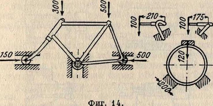 5—6 миллиметров. Машина служит только для сравнительных испытаний, причем счетчик отмечает число колебаний, выдержанных рамой до поломки. Испытание статическ. нагрузкой производится по схеме, приведенной на фигуре 14, где указаны размеры и направления нагрузок при испытании рамы, руля,