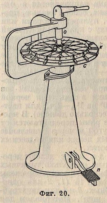 Весьма ответственной работой является сборка колес. Для ускорения этой работы на всех крупныхзаводах применяются специальн. станки (фигура20). Втулку со вставленными уже в нее спицами надевают на ось о, после чего кладут обод на круглый вращающийся стол с и зажимают цен-трующе посредством щек к, которые приводятся в движение от педали п. Навинчивание и предварительную затяжку ниппелей производят либо вручную, либо помощью механической отвертки, с передачей через фрикционную муфту от электромотора; в первом случае равномерность затяжки зависит от опытности мастера, во втором — она