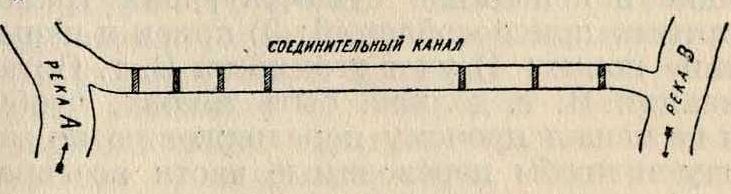 Применение шлюзов позволяет также соединять судоходными каналами через водоразделы две реки, что видно из фигура 2. Дальнейший толчок к развитью искусственных водных путей дало изобретение в начале 19 в разборчатой плотины Пуаре (смотрите). Применение плотины этого типа позволяет