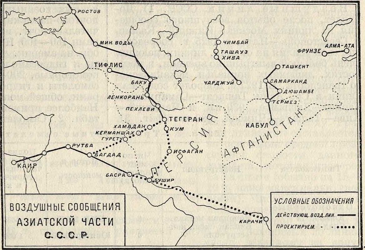 В конце 1927 г. открылись регулярн. рейсы по линиям Фрунзе—Алма-Ата, 240 км, и Ташкент—Термез—Кабул, 1140 км. В Забайкалья действует линия того же общества: Верхнеудинск — Урга (в Монголии), в 600 км, с намеченным продлением до Пекина. О даваемой этими линиями громадной экономии времени дает понятие табл. 1. 2) Укрвоздухпуть в 1927 г. эксплоатировал ежедневную линию Москва—Баку, 2 510 км, через Харьков—Ростов—Минерал. Воды— Грозный. Открыто продление этой линии до Пехлеви (Энзели, Сев. Персия) для смыкания с персидско-германской линией Юнкер-са Пехлеви—Тегеран. 3) Дерулуфт в 1927 г. работал на линии Москва—Кенигсберг— Берлин, протяжением в 1 800 км. Перечи сленные линии, кроме азиатских, работают только в летнее время, азиатские же линии действуют почти весь год, с небольшими перерывами в зимние месяцы.