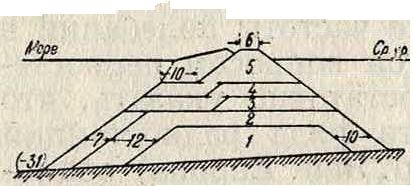 с пологими откосами (размеры в м). Внутренняя часть А исполнена из наброски камней весом до 1 я и более; на откосы уложены еще более крупные по весу камни. Стремление связать между собой тяжелые массивы, чтобы затруднить возможность переброски их через гребень волнолома, привело к конструкции, изображенной на фигуре 2, представляющей В. в фиг 2. Марселе, построен ный на песчаном основании из естественных и искусственных массивов. Строение этого В. таково: центральная часть 1 состоит из щебня и обломков камня; следующие слои состоят: 2 — из камней весом 3—100 килограмм, 3—из ней весом 100—1 300 килограмм, 4—из бетонных сивов весом 1,3—