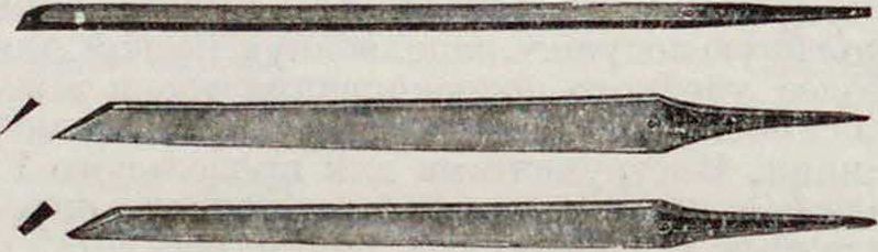 без малейшего опасения их излома. Применение штихе л я вместо ножа упростило и ускорило Г. и создало т. н. тоновую гравюру, построенную на передаче формы при помощи комбинаций б. или м. близко лежащих параллельных или пересекающихся линий, создающих впечатление тона большей или меньшей темноты. Техника Г. на торце разрешила задачу передачи в гравюре не только техники пера равномерно окрашенным штрихом, но и техники карандаша, угля и особенно живописи. Штихеля, употребляемые в Г., представляют собою стальные стержни (фигура 4). Передний конец штихеля затачивается плоскостью под углом в 40—50°; эта плоскость и является режущей поверхностью при движении штихеля с нажимом по доске. Более тупой угол резал бы хуже, более острый заставил бы штихель зарываться. С противоположного конца штихель оттянут, и на этот конец насаживается точеная ручка, имеющая форму груши или, чаще, форму гриба со срезанной с нижней стороны шляпкой. Этот срез нужен для прижимания штихеля к доске и он же мешает положенному штихелю кататься по столу. Штихеля изготовляются различных профилей; наиболее употребительные из них: