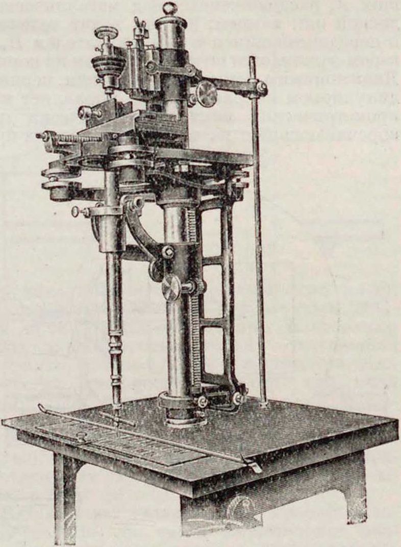 К гравировальным машинам до известной степени м. б. отнесены и машины, работающие сверлом или фрезером (фигура 11). Простейший вид такой машины—вертикальный фрезер на двуплечем горизонтальном рычаге, которым пользуются в цннкографском производстве, чтобы высверливать белые места цинкографского клише, вместо того чтобы травить их кислотой. Этим фрезером можно пользоваться для той же цели и в ксилографии. В соединении с механическим пантографом такой фрезер может по выпуклому шаблону гравировать пунсон.