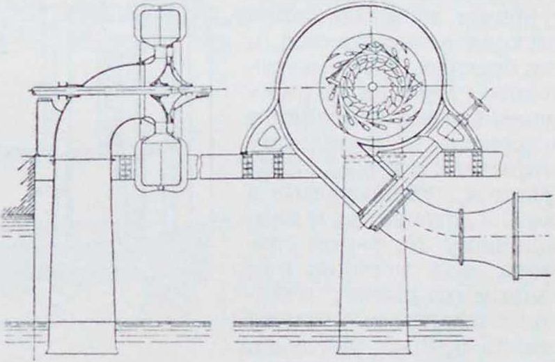 применяются лишь при небольшой мощности и большом напоре. Изредка, для повышения числа оборотов генератора и удешевления его, вводят между вертикальными валами турбины и генератора цилиндрическую зубчатую передачу, которая теперь с большим совершенством изготовляется на большие мощности и на передаточн. числа. При напорах до 10—15 .и мелкие и средние турбины ставят в открытые камеры (фигура 14). Если на вал турбины не посажен генератор, то передача на горизонтальный привод с горизонтального вала берется ремнем или канатами, а с вертикального—зубчатым колесом; последи, надо стараться избегать из-за сотрясений и износа. При больших напорах турбины ставят в металлическ. закрытые камеры в виде цилиндрических или конических кожухов (фигура 12). Для уменьшения потерь от беспорядочного