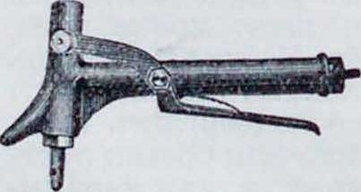 иных специальных пропиточных приспосо-бдений. Наиболее достигает цели пропитка в особых автоклавах, где сначала производится разрежение, например, до 0,01 atm, а затем вводится жидкость под атмосферным или повышенным до 8—9 atm давлением. Вид такого автоклава показан на фигуре 1. Однако, затруднение иметь достаточно мощные установки этого рода, и притом близко к местам потребления, заставило искать менее громоздких приспособлений. Таковы наконечники, надеваемые на строевой лес, кольца, цилиндры с решетчатым дном, и т. д. Для пропитки комлей столбов нередко применяются открытые баки без давления, размерами 3,3 х 1,7 х 3 метров (на 30—35 столбов) или 1,5х2,5x3 метров (на 50—60 столбов); при этих баках имеются закрытые баки для холодного и горячего креозота: первый емкостью 53 м3, а второй 11—48 .и3 (фигура 2). В других приспособлениях техника подражает змеиному зубу: накалывающее шнло имеет внутри тя пал, а сбоку—отверстие, через которое при обратном ходе этого шила в дерево выступает под давлением антисептич. паста. Этот аппарат («Кобра» К. Шмиттуца и Негера, прибор К. Шангу) имеет то преимущество, что он применим на месте установки столбов или другого строевого леса; кроме того, накалыванию но способу «Кобра» могут подвергаться уже установленные столбы, даже когда они уже частично подверглись гниению. Вид прибора «Кобра» для бревен представлен на фигуре 3, а молотка для накалывания установленных столбов—на фигура 4.