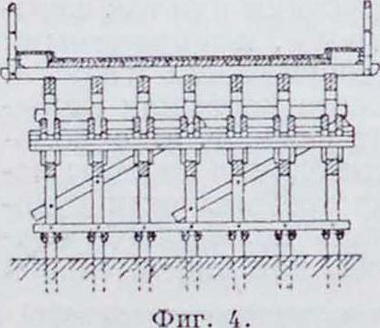 (фигура 2), или комбинированная (фигура 3). Наилучший угол наклона подкосов в этих системах 40—45°, от которого по местным условиям иногда приходится сильно уклоняться. Для поддержания стыков прогонов применяются под ними так называемым подбалки. В шпренгелыгай системе брус под прогоном, в который упираются верхние концы подкосов, называется ригелем и делается длиною ок. 0,4 расстояния между опорами. Ряды свай в опоре соединяются горизонтальными (продольными и поперечными) и диагональными схватками из пластин, брусьев или досок (фигура 4). Арочная система (фигура 5) позволяет перекрывать пролеты до 20—25 метров и больше.