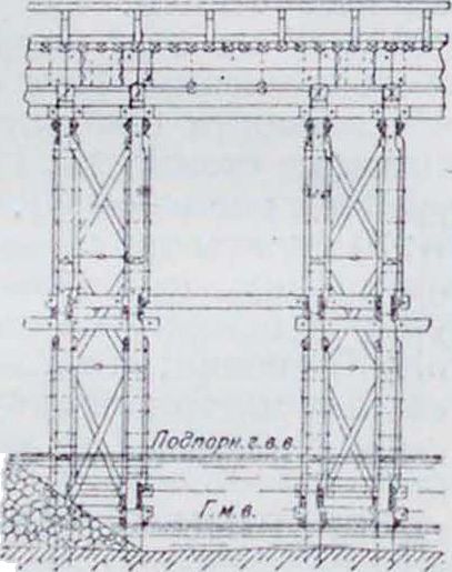 Опоры деревянных мостов с фермам и делаются свайные, рамные, ряжевые или каменные. В последнем случае деревянное пролетное строение укладывается временно вместо металлического или железобетонного. Свайная опора состоит из нескольких рядов свай. Для придания устойчивости служат боковые подкосы и схватки. Ряж представляет собой ящик с вертикальными стенками и сквозным полом. Все стены ряжа образованы венцами из горизонтально уложенных бревен, скрепленных в углах врубками (смотрите); верхние и нижние постели этих бревен стесаны для достижения большей плотности швов. Стенки ящика соединяют горизонтальн. распорками, образующими как бы вертикальные сквозные перегородки. Для укрепления стен ряжа ставят стойки. Ряж заполняют камнем.
