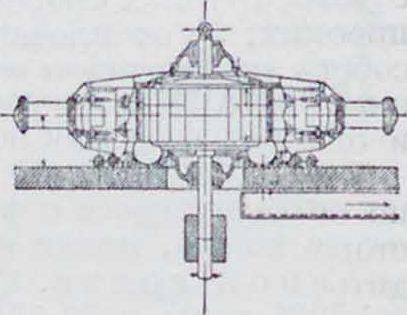 Наиболее удачным является равномерное распределение прессов по всей окружности, как это было осуществлено на горизонтальн. дефибрерах, изображенных в плане и разрезе на фигуре 3. Здесь ось Д. совсем не испытывает одностороннего бокового давления. Такая конструкция имела еще и то удобство, что позволяла закреплять камень на оси вертикальных турбин. Но в силу нек-рых других причин, указанных ниже, эта система также не находит теперь применения. В целях устранения одностороннего давления на ось Д. и для повышения кпд, нек-рые конструкторы (наир., Dills) располагали прессы так. оор.,