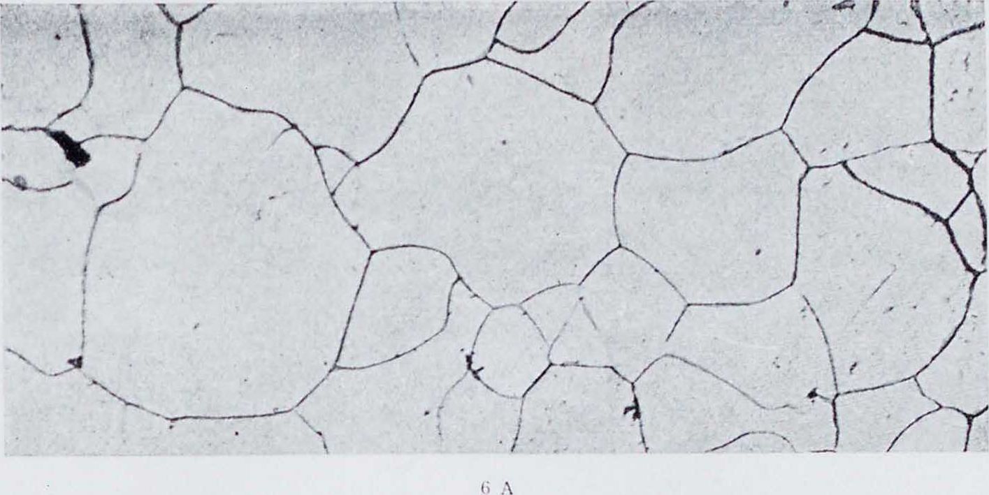 8. а) Сильно наклепанный и нагретый до 215 лист Sn; большая наклепка повела к образованию большого количества кристаллов. 6) То же, согнутый по окружности R .300 сантиметров и нагретый затем до 215е; к зоне 7-мм ширины, получившей только упругую деформацию, прилегают крупные кристаллы, в) То же, но R 75 сантиметров средняя неизмененная зона уменьшилась до 2 миллиметров. г) То же, по R 21 сантиметров центральная зона исчезла, на краях появились мелкие кристаллы. 9. Лист олова, толщиною 2 миллиметров у пробит на холоду и нагрет до /с рекристаллизации 200.