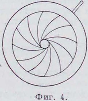 Кроме того, в кино нередко применяется ирисовая Д., расположенная на том или ином расстоянии перед объективом, т. н. американская, или концентрическая Д., которая при закрывании затемняет, как бы тушует, не весь снимок сразу, а постепенно от краев внутрь, так что середина остается до конца ясной в постепенно смыкающемся с размытыми краями кружке. Такая Д. (смотрите фигура 5—конструкция известной америк. фирмы Белл и Гауел) обычно располагается на особом су порте, прикрепляемом или к штативу или к передней стенке аппарата, и соединяется с аппаратом складным тубусом для уничтожения вредных засвечиваний и рефлексов. За последнее время Фигура 5. широко входят в упо требление такие Д.с прозрачными или полупрозрачными лепестками, сделанными из белого или неокрашенного целлюлоида.