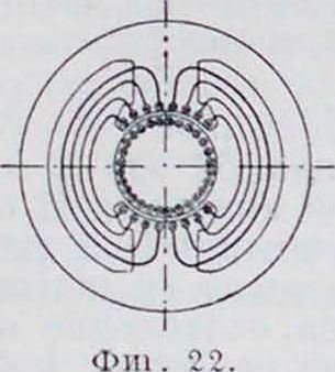 Фиг. цми обмотки под северным и южным полюсами магнитов (фигура 5) одними концами соединены между собой, другими—с полукольцами коллектора. Эдс, наводимая в обеих секциях за время их прохождения иод полюсами, сохраняет одинаковое направление. При вступлении секций в сферу влияния полюсов противоположной полярности каждое из полуколец коллектора вступает в контакт с другой щеткой, вследствие чего направление эдс во внешней цепи остается без изменения. Величина эдс меняется от нуля до максимума, то есть является пульсирующей. Открытыми обмотками пользовались в своих машинах Сименс,Томсон-Гаустон, Бреш (Brush) и Вестингауз. В настоящее время они применяются довольно редко. Замкнутая обмотка (фигура 0), наоборот, получила широкое распространение, особенно барабанная (намотанная на цилиндр). С целью уменьшения воздушного зазора между якорем и полюсными наконечниками применяются, по предложению Венштрема (1882 г.), якори с пазами. Группы обмоток, составленные из секций в замкнутой обмотке, остаются при всяком положении якоря параллельно соединенными между собой. В так называемой последовательной, или волновой, обмотке—две параллельные ветви, в параллельной же, или петлевой,—число параллельных ветвей равно числу полюсов. В каждой из этих систем обмоток число параллельных ветвей может быть в несколько раз увеличено (многократные обмотки).