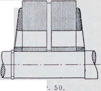 Обмотка возбуждения образуется или из круглой медной проволоки или из прямоугольной, наматываемой на ребро. Круглая проволока идет на намотку полюсных катушек, гл. обр., шунтовых машин, прямоугольная—на катушки вспомогательных полюсов и возбудительную обмотку последовательных машин. Изолированная медная проволока наматывается на особые гильзы, которые изготовляются либо из изолирующего вещества (пропитанного прессованного картона, изолита и тому подобное.) либо из жести. Гильза надевается на сердечник и удерживается на нем выступающими краями полюсного наконечника или особыми шпильками. Для лучшего охлаждения обмотки катушки делают б. ч. не толще 4—5 см. Иногда приходится под-Фигура 58. разделять ее на ча сти в поперечном или продольном направлении или и в том и в другом, чтобы увеличить площадь охлаждения (фигура 58). В закрытых трамвайных двигателях применяются катушки из изолированного медного провода прямоугольного или квадратного сечения. Катушки изолируются хлопчатобумажной лентой и пропитываются, сперва под вакуумом и затем под давлением, особой изолирующей (так называемой компаундной) массой, заполняющей все пустоты катушки, так что после осты