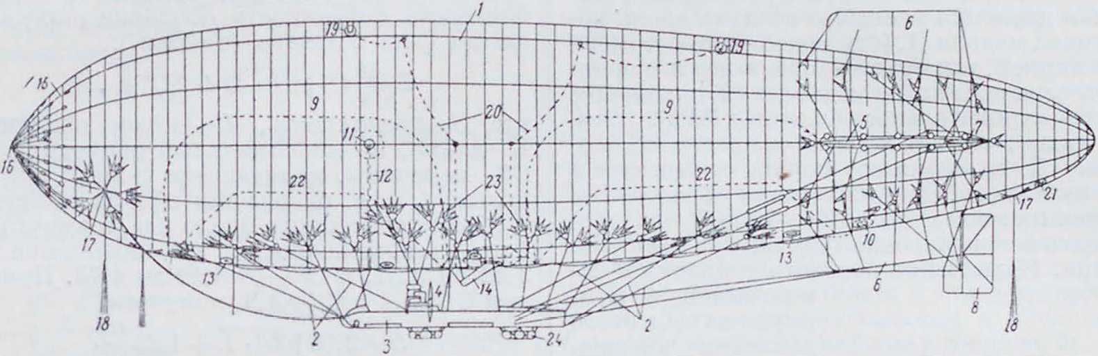 глубины и вертикальными рулями направления. К нижней части корпуса (непосредственно или при помощи строп) прикрепляют одну или несколько гондол, в которых располагаются команда и пассажиры, моторы, снаряжение и прочие В настоящее время строят три системы Д.: 1) мягкую, 2) полужест-кую и 3) жесткую. В мягкой системе корпус, изготовленный из материн, служит вместе с тем и оболочкой для газа; в жесткой—корпус образует жесткое сооружение из дуралю-миниевых, стальных или деревянных балок, обтянутых снаружи материей, а газ помещается внутри корпуса в особых газовых мешках, обычно из бодрюшировапной ткани (смотрите Бодрюш)·, полужесткая система отличается от мягкой лишь тем, что в нижней, килевой части оболочка имеет шарнирную балку из стальных или дуралюмипиевых труб, проходящую вдоль всего корпуса и оболочке 2, при помощи строп 2, подвешена гондола 3 с винтомоторной установкой 4. На корме оболочки расположено оперение: горизонтальные 5 и вертикальные 6 неподвижные планы с прикрепленными к ним при помощи шарниров р у л я м и высоты 7 п направления 8. Внутри оболочки находятся баллонет ы 9 для воздуха. Но оболочке I асположены клапан ы. которые служат для выпуска части газа из оболочки; они м. б.: а) автоматические предохранительные 20, открывающиеся при чрезмерном повышении сверхдавления газа, и б) управляемые 22 для маневрирования или спуска Д. Предохранительные клапаны помещают обыкновенно в нижней части оболочки, ближе к корме, во избежание соприкосновения выходящего газа с выхлопными трубами моторов; управляемые же клапаны располагаются наверху или сбоку в передней части Д. и открываются при помощи клапанной веревки 12, проходящей внутри оболочки. Клапаны 13 служат для выпуска воздуха из баллонетов. Воздух поступает из вентилятора а (фигура 2) в баллонет по шлангу б. На случай отказа в работе вентиляторного мотора, устраивается иногда матерчатый каркасированныйоткрытый снизу шланг — улавливатель 14 (фигура 1), помещаемый сзади винта, при вращении которого в него попадает струя воздуха. В Д. системы Парсеваля наличие двух баллонетов и специальных клапанов для распределения между ними подаваемого воздуха позволяет пользоваться баллонетами и для управления Д. в вертикальной плоскости: для подъема задний баллонет наполняется воздухом больше переднего, для спуска, наоборот, передний наполняют более заднего.