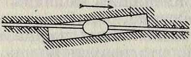благодаря сдвигающейся к периферии точке пересечения насечек обоих камней (насечка верхнего камня обозначена пунктиром), а также под влиянием центробежной силы, измельчается и дефибрируется трением частичек между собой и о поверхность камней. Поступление массы в промежуток между насечками камней и дальнейшее ее измельчение при смещении насечек изображено на фигуре 14.