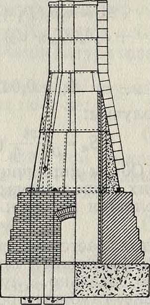 где, кроме вышепринятых обозначений, Ώ— диаметр нижнего основания фундамента в ж (внутренний диам. d=0), U—объём бутовой кладки фундамента и бетонного основания. Вес 1 ж? кладки фундамента принимается равным 2 260 килограмм. При расчете кирпичной Д. т. высотой до 30 метров допускается напряжение на сжатие до 12 килограмма/см2, а на растяжение—до 1,2 килограмма/см2. Для Д. т. большей высоты это напряжение уменьшается на каждый ж высоты на 0,05 килограмм /см2; т. о., для Д. т. высотою более 54 метров напряжение на растяжение не допускается. При расчете же фундамента Д. т. в плоскости соприкосновения его с грунтом напряжение на растяжение вовсе не допускается. Во многих западных странах имеются специальные утвержденные требования, предъявляемые к кирпичным Д. т.