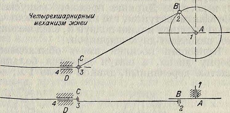 Кривошипный механизм передает движение из плоскости вращения кривошипа в плоскость движения ножа. Плоскость вращения кривошипа не во всех косилках имеет вертикальное направление; в косилках типа Мак-Кормика, Новь, Круппа, Дейтше-Верке она составляет угол с вертикальной плоскостью, в косилке же Диринга она почти вертикальна. Плоскость движения ножа (перпендикулярная к средней плоскости ножевых сегментов) не может быть горизонтальна, так как пальцейый брус устанавливается под различными углами к горизонту. Поэтому кривошипный механизм в косилке является не плоским механизмом, как, например, в жнеях или в паровых машинах, а пространственным; пространственный механизм должен состоять из семи шарниров, в отличие от плоского, где достаточно четырех шарниров. По схеме кривошипного механизма, представленной на фигуре 12, один шарнир (соединение с пальцевым брусом) заменен ползуном; следовательно, получаются для плоского механизма три шарнира А, В и С и один ползун D. В пространственном кривошипном механизме один шарнир также заменен ползуном D, другие два шарнира, соединяющие шатун с