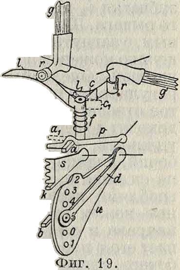 рые катятся по особым искривленным дорожкам; в том положении, когда грабля подходит к ножам, дорояс-ка разделяется на две части — верхнюю и нижнюю (по схеме на фигуре 19: внешняя дорожка I, внутренняя — it); если ролик идет по верхней дорожке, то грабля пригибает стебли к ноясам, а затем поднимается кверху, проходя мимо платформы, не трогая снопа; если же ролик идет по нижней дорояже, то грабля проходит вдоль платформы и сбрасывает сноп. При переходе на верхнюю или нижнюю дорожку стоит стрелка с снабженная пружиной /; проходя при открытом полоясении сх стрелки по нижней дорожке, ролик (вращая стрелку из положения сх в положение с) закрывает за собой стрелку и заставляет следующую граблю идти поверху. В закрытом положении стрелка удеряжвается посредством особой защелки, состоящей из крючка р и отростка а стрелки (ах — положение отростка, сооветствующее положению с“ стрелки). Крючок нужно снять, чтобы под действием пружины открылась стрелка. Снятием крючка заведует автоматически действующий прибор, называемый счетчиком. В зависимости от густоты хлеба счетчик устанавливают так, чтобы он пропускал грабли вдоль платформы подряд или через одну, две, три и т. д. Если яселательно сбрасывать снопы один подле другого при каждом следующем заезде, то счетчик ставят на нуль и действуют педалью. Существуют 4 типа счетчиков: червячный, или секторный, храповой, кулачный и улиточный. Секторный счетчик состоит из еле- ^ дующих частей: на вер- Ш тикальном валу о гра- Щ, бельной колонки наса-яШ ясен червяк т с четырь- Г||| мя неполными винтовы- „Ц), ми ходами, с которыми сцепляется рычажок-сектор s. При движении сектора s вверх он снимает крючок р, освобождая таким образ, отросток а стрелки; при падении его вниз кулачок к упирается в выступ Ь рычажка d, перестанавливаемого по сектору и на соответствующее ренсиму работы граблей отверстие (по схеме 5). Хра-
