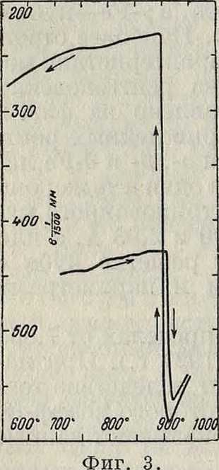 Понижение коэффициентов расширения в интервалах 20—800°, 20—900°, 700—800° и 800— 900° объясняется аномалиями в расширении при переходе через критич. точки ACri и АСз. Этот переход сопровождается сжатием, особенно резко выраженным в точке А,.3, как показывают кривые сжатия и расширения на фигуре 3. Плавление Ж. сопровождается расширением его на 4,4% (Гонда и Энда, 1926 г.). Теплоемкость Ж. довольно значительна по сравнению с другими металлами и выражается для разных 4°-ных интервалов величинами от 0,11 до 0,20 cal, как показы-